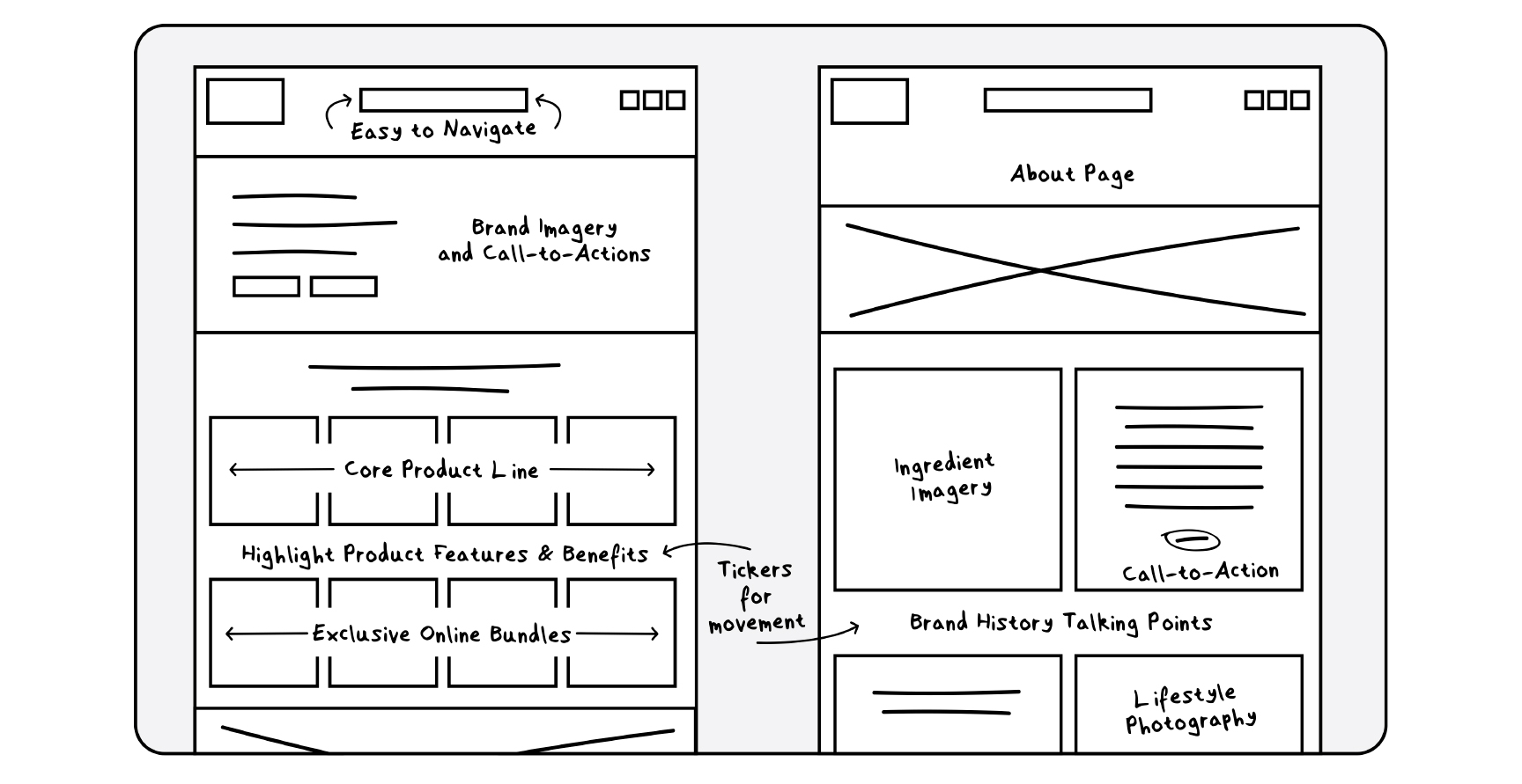 By detailing the layout, navigation, and key elements of each page, we established a strategic foundation for the design. To balance a “Cowboy culture” aesthetic with appeal to a broader animal-loving audience, while also highlighting the premium quality of the ingredients and products, we strategically incorporated callouts, lifestyle imagery, and calls-to-action.
